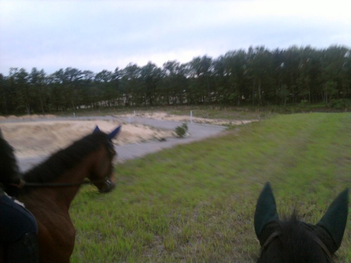 We cut through the edge of a development and rode up a really cool hill, which was great for strengthening and fitness. From the top, we could see a nice view. We descended and kept on riding. We reached a grassy field, where my friend asked if we could do a little trot. Why not?