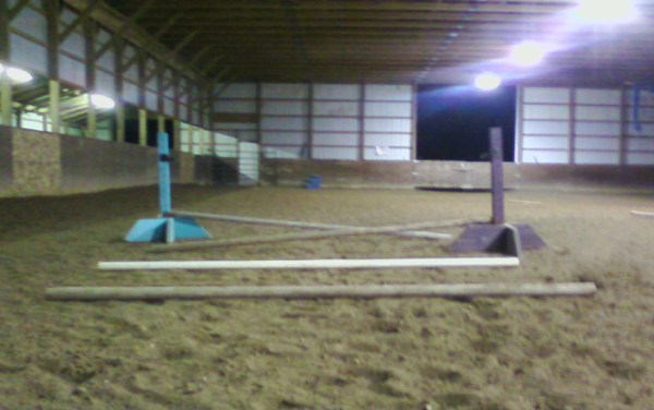 So I pulled out my copy of 101 Jumping Exercises for Horse & Rider for inspiration. I decided that raised trot poles were a good idea, so I set up four poles with two on the ground and two raised a few inches off the ground, one lifted on the left side and one lifted on the right (see photo). I also set up two poles on a straight line so I could practice circles (see diagram below).