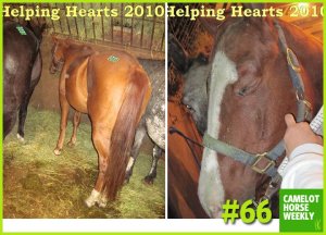 One of my favorite things about working with equine rescues and auction horses is seeing the transformation that takes place once the horses are in their new homes and are blossoming with good care. It takes a little imagination for your mind’s eye to envision a slick summer coat under a fuzzy winter coat, and to add 100 pounds to an underweight horse, but these photos can help to crystalize the potential that these horses have: